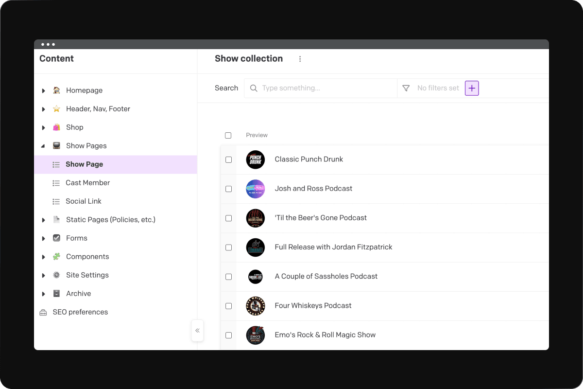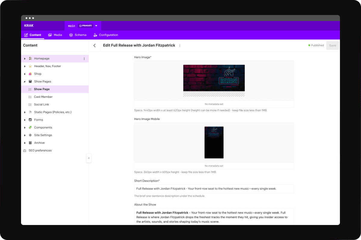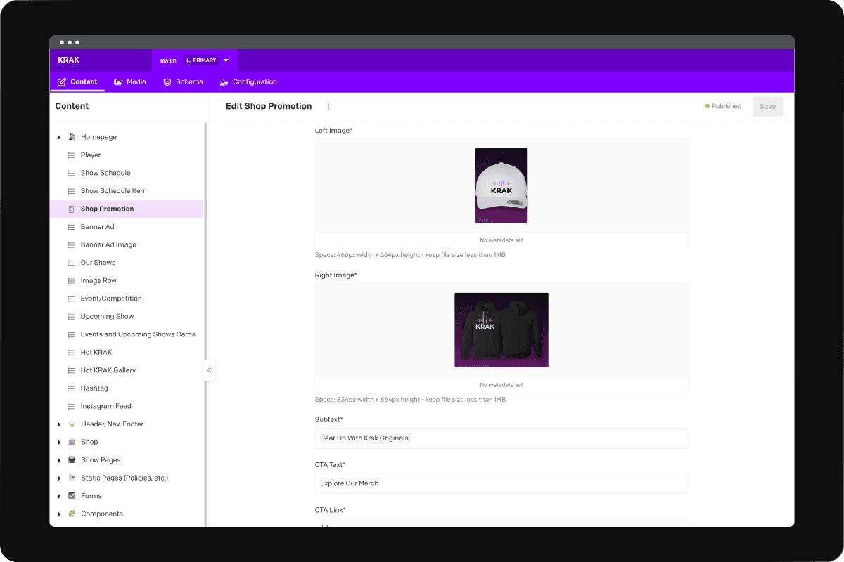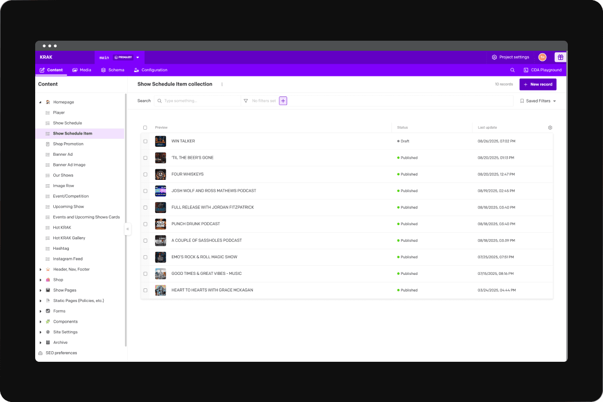 We implemented a headless architecture using DatoCMS for content and headless Shopify for commerce, separating content, commerce, and presentation so KRAK can update schedules, guests, show pages, events, and promos quickly without engineering bottlenecks. Powered by a custom, flexible backend tech stack, this approach makes the platform easy to expand and future-proof, enabling new front-end experiences, new sections, new devices, and new revenue models without re-platforming, while giving content teams speed, control, and consistency at scale.
