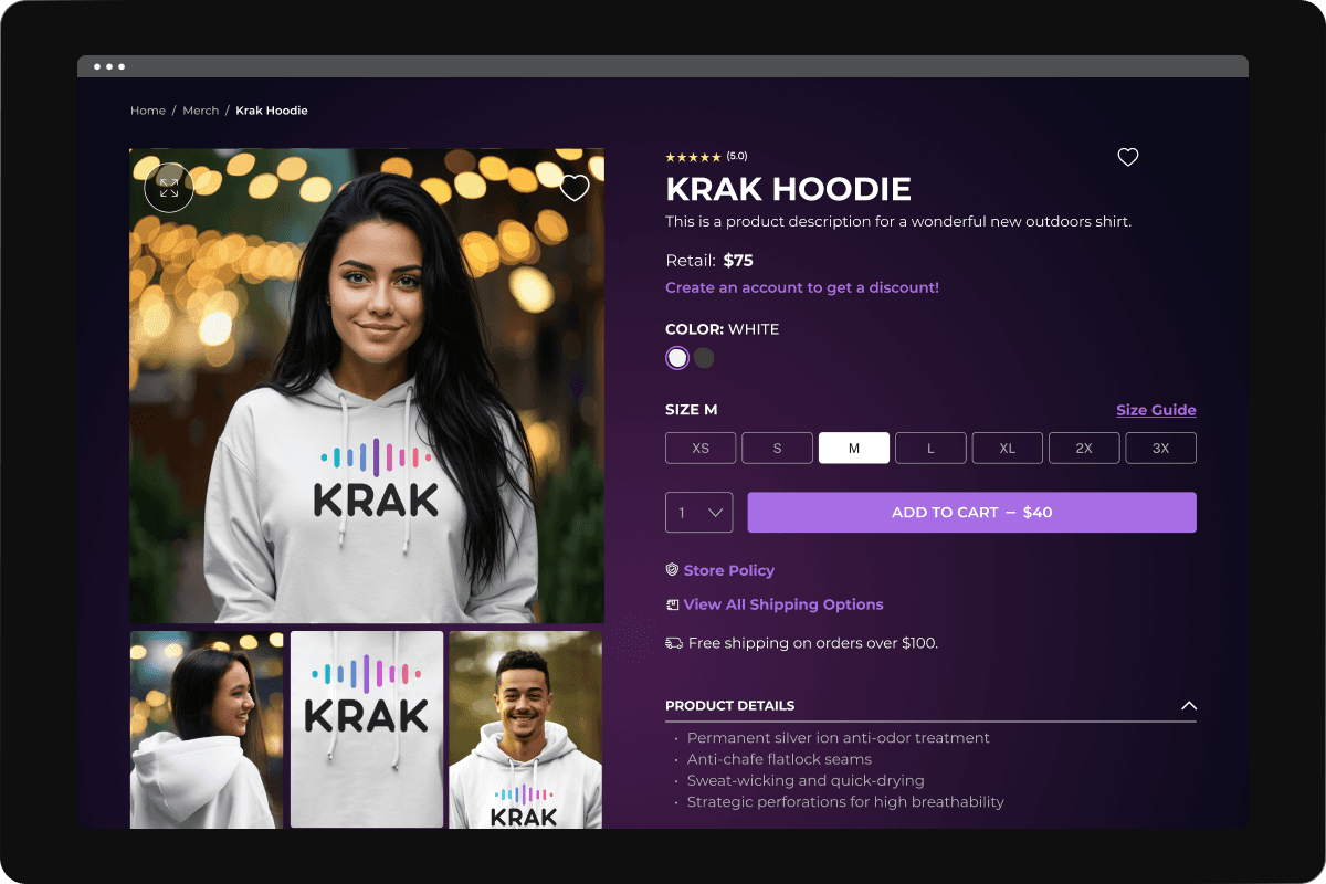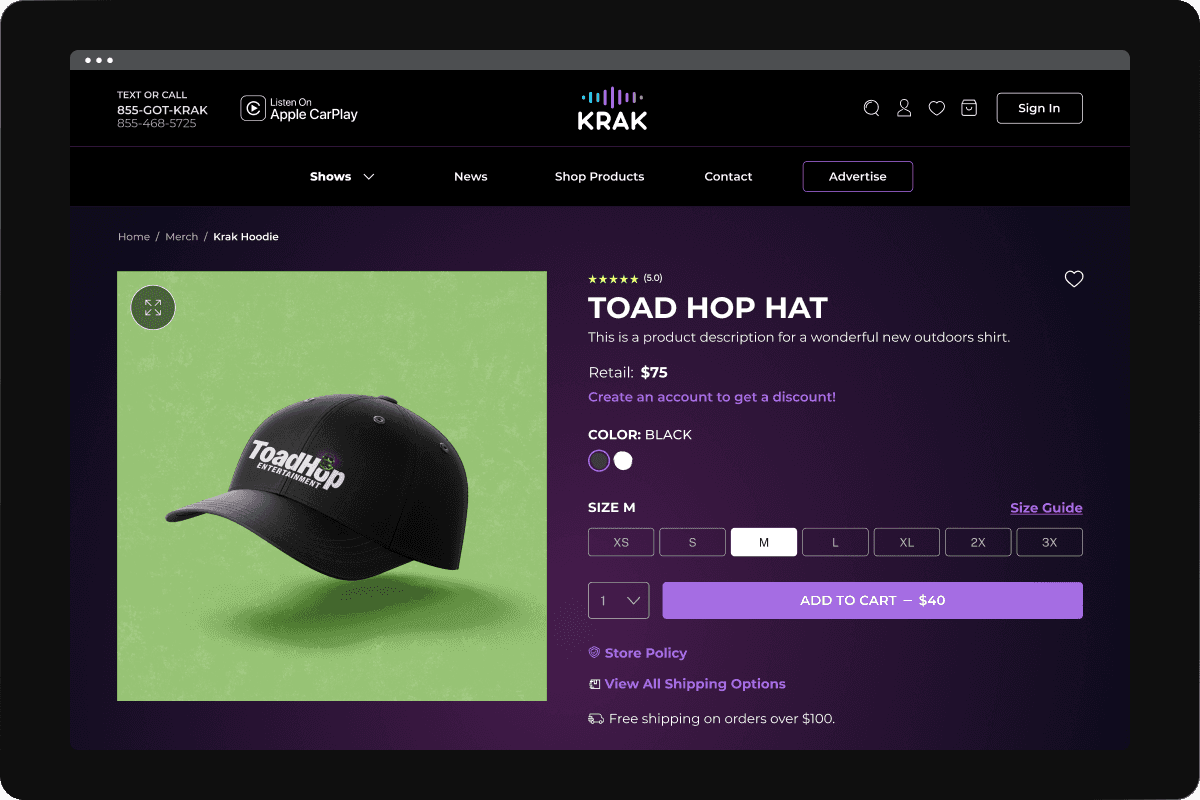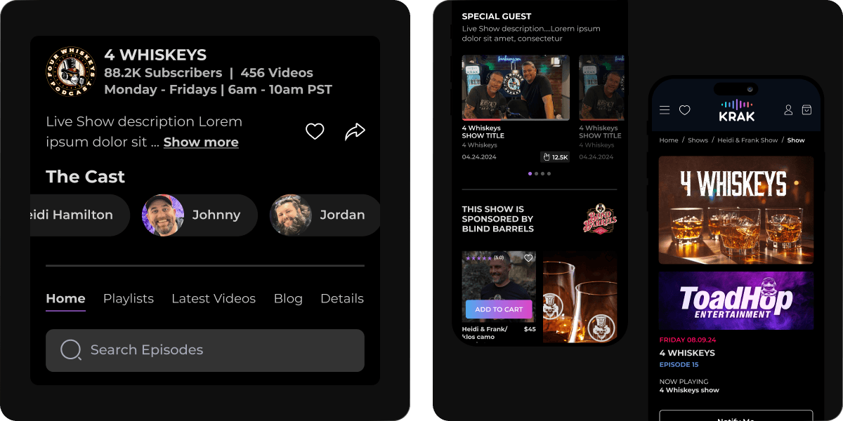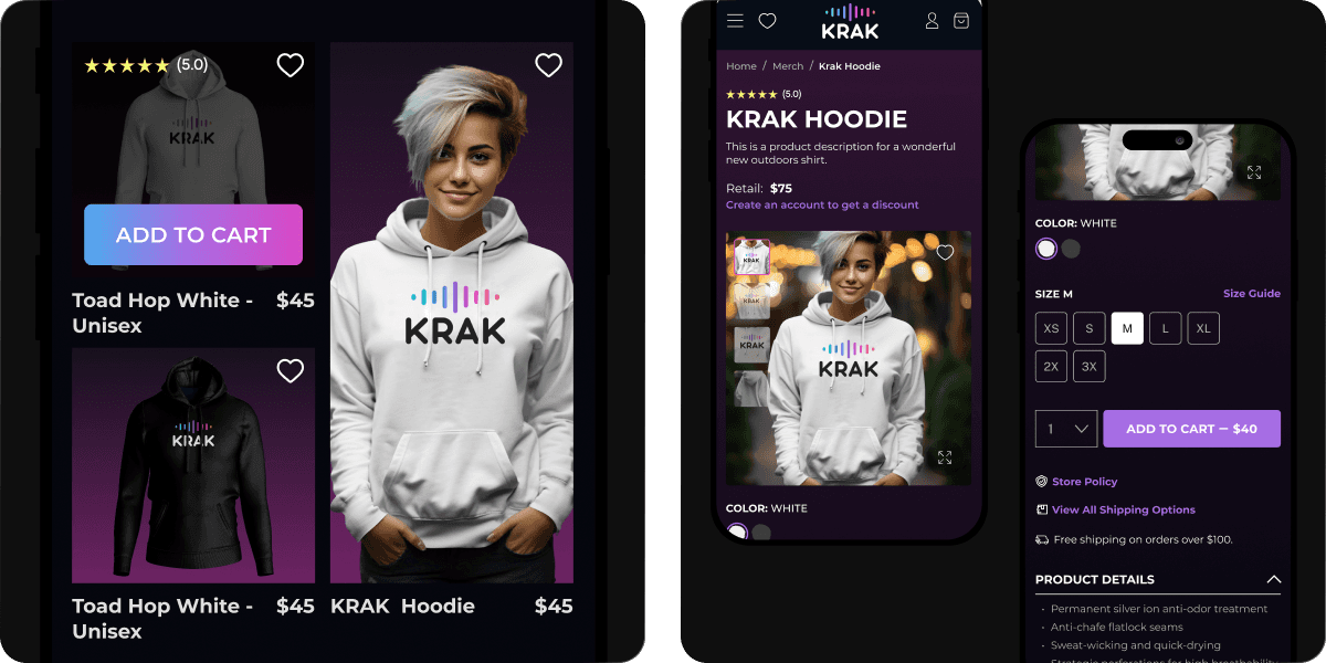KRAK’s store was designed to feel native to the streaming experience, connecting merch directly to shows, talent, guests, and sponsors so shopping flows naturally from fandom instead of feeling bolted on. We built browsing and product detail pages around confidence and discovery, clear product storytelling, clean option selection, and smart cross-merchandising like shopping by show, collection, or sponsor, making it easy to explore, buy on impulse, and return for future drops while increasing sponsor visibility.