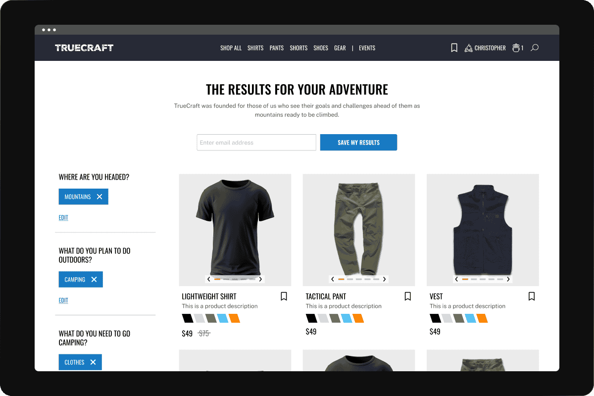 TrueCraft’s original ecommerce model was built to sell products, but it didn’t reflect how outdoor customers actually shop and prepare. People aren’t only searching for a single item like a jacket or leggings, they’re trying to solve for a place, a forecast, a planned activity, and a full system of gear that works together. Without a Destination-style experience, customers had to stitch together decisions on their own, which created unnecessary friction, limited the size and completeness of carts, and reduced reasons to return after a one-time purchase. At the same time, TrueCraft was missing opportunities to monetize the broader adventure lifecycle, including event participation and experience bookings, and it lacked fit confidence tooling that could help shoppers choose the right size without hesitation.